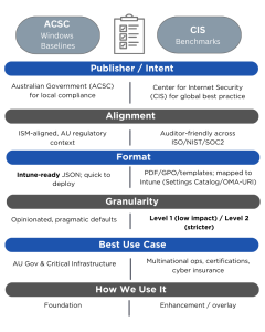 • ACSC Windows Baselines give Australian organisations a fast, compliant starting point for Windows security—natively deployable via Intune.